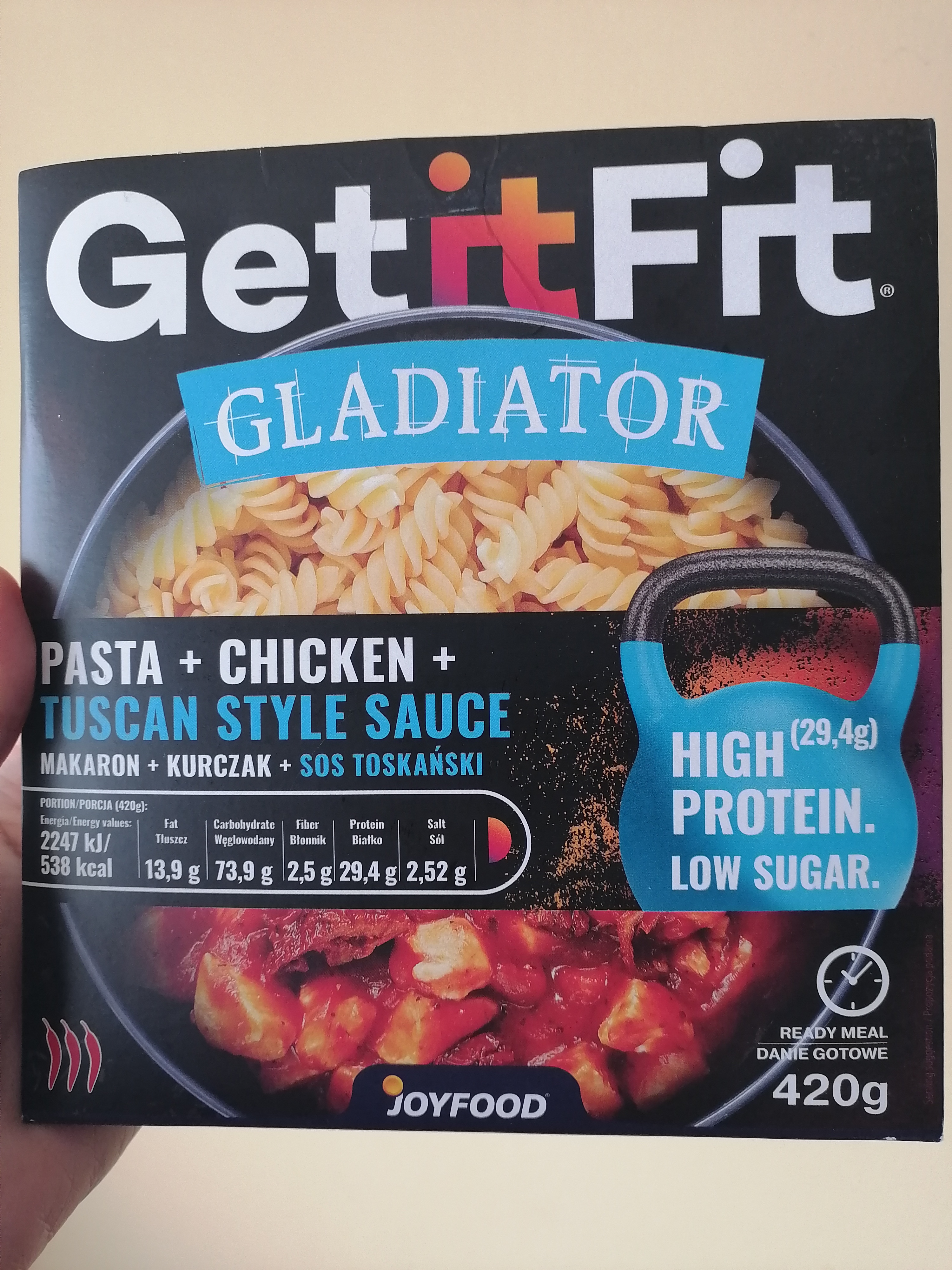 Przykładem takich "gotowców" z dobrym składem mogą być posiłki GetitFit firmy JoyFood dostępne w sieci Rossmann. Kupiłam ostatnio wersję Gladiator, czyli makaron z kurczakiem w sosie toskańskim. W składzie znajdziemy m.in. makaron z pszenicy durum, filet z piersi kurczaka, pomidory pelati oraz przyprawy. Nie ma tu dodanego cukru ani syropu glukozowo-fruktozowego, a typ pszenicy (durum) sprawia, że jest to posiłek, który mogą zjeść także osoby chorujące na cukrzycę. Choć musimy pamiętać, że w posiłku nie ma warzyw, trzeba więc samemu postarać się o jakąś surówkę.